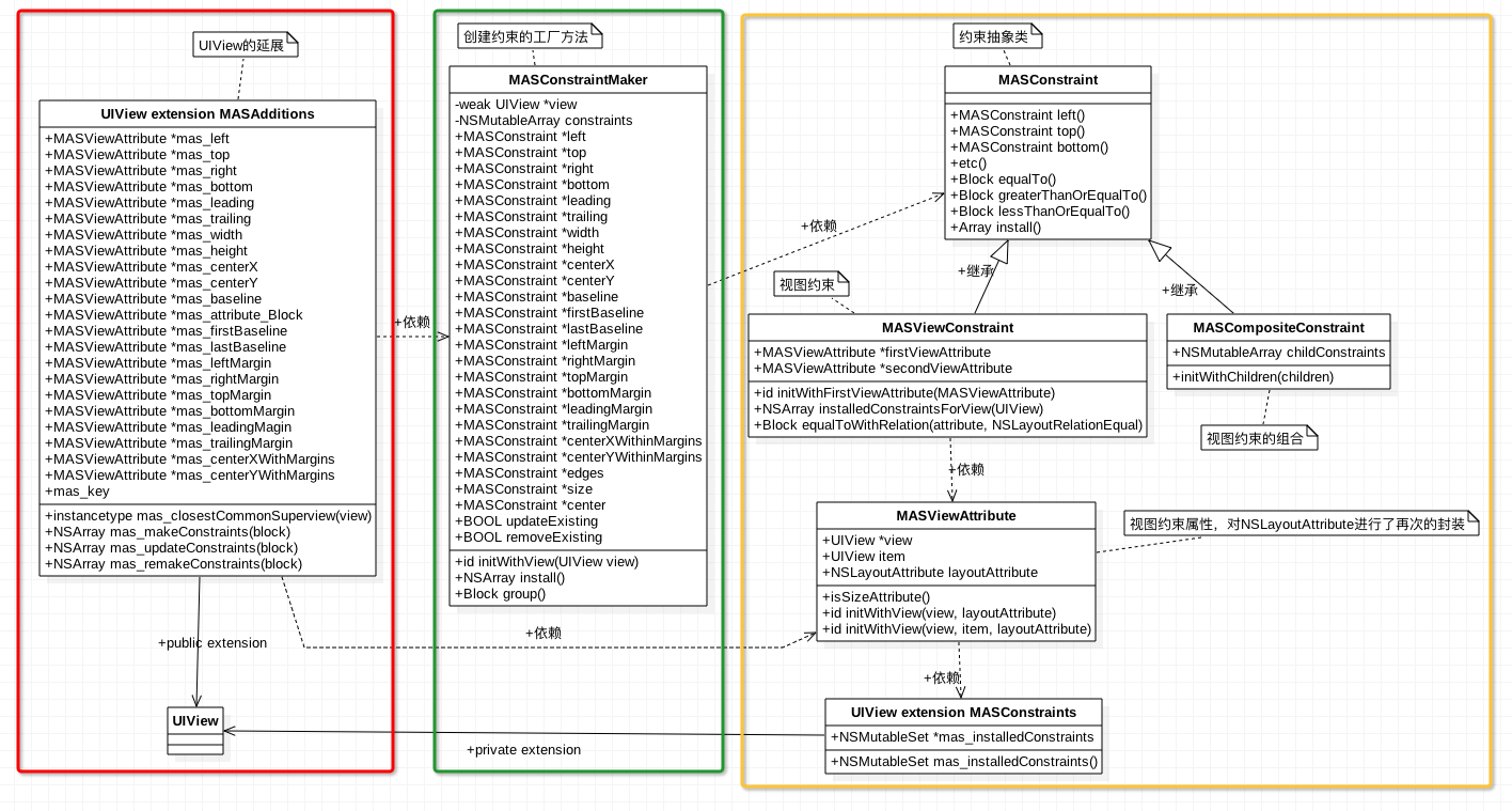 2. View+MASAdditions:使用mas_makeConstraints/mas_updateConstraints/mas_remakeConstraints等核心入口方法来设置约束,最常用的的核心是mas_updateConstraints,一般来说,使用这个方法即可。