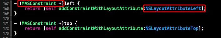 通过上述成员属性所对应的getter方法,我们可以对其中所存储的内容一目了然。下方是mas_left、mas_top和mas_right成员属性所对应的getter方法,其中所做的事情就是对MASViewAttibute进行实例化,在实例化时指定当前视图所对应的LayoutAttribute。也就是mas_left = self + NSLayoutAttributeLeft, mas_top = self +NSLayoutAttributeTop,当然此处的self就代表当前视图。