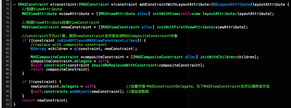 上面在介绍类图的时候也提到了,用户是通过调用mas_makeConstraints方法来为当前视图添加约束的。下方代码就是mas_makeConstraints函数的代码实现,根据个人理解,对每行代码进行了中文注释,接下来我们来好好的看一下该函数的结构.mas_makeConstraints方法的返回值是一个数组(NSArray),数组中所存放的就是当前视图中所添加的所有约束。因为Masonry框架对NSLayoutConstraint封装成了MASViewConstraint,所有此处数组中存储的是MASViewConstraint对象。