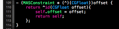 而像offset(10)这种调用方式是如何实现的呢?我们知道在OC中是不能通过小括号来调用方法的,那边闭包是可以的,不过offset()不是一个简单的闭包。在offset()的代码分析后我们不难发现offset() = offset + (); offset的代码实现方式如下。offset是一个getter方法的名,offset函数的返回值是一个匿名Block,也就是offset后边的()。这个匿名闭包有一个CGFloat的参数,为了支持链式调用该匿名闭包返回一个MASConstraint的对象。