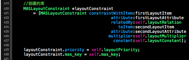 MASViewConstraint中install方法负责创建MASLayoutConstraint对象,并且将该对象添加到相应的View上。下方代码就是install中根据MASViewConstraint所收集的参数来创建NSLayoutConstraint对象,下方的MASLayoutConstraint其实就是NSLayoutConstraint的别名。下方就是调用系统的NSLayoutConstraint为创建相应的约束对象,下方的构造器与第一部分中的NSLayoutConstraint一致。