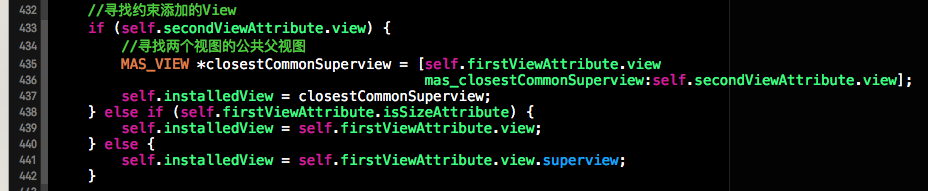 mas_closestCommonSuperview方法负责计算出两个视图的公共父视图,这个类似求两个数字的最小公倍数。下方的代码就是寻找两个视图的公共父视图,当然是最近的那个公共父视图。如果找到了就返回,如果找不到就返回nil。寻找两个视图的公共父视图对于约束的添加来说是非常重要的,因为相对的约束是添加到其公 共父视图上的。比如举个列子 viewA.left = viewB.right + 10, 因为是viewA与viewB的相对约束,那么约束是添加在viewA与viewB的公共父视图上的,如果viewB是viewA的父视图,那么约束就添加在viewB上从而对viewA起到约束作用。