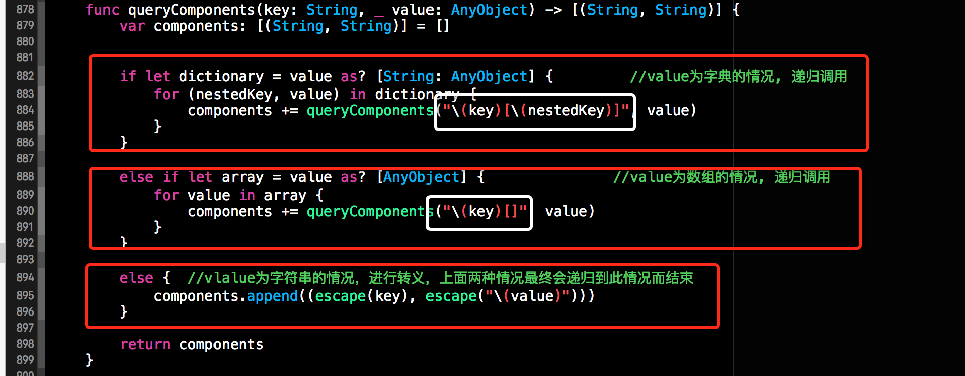 在上述代码中,功能并不算复杂。就是递归将字典中的所有键值对转变成key=value、key[]=value、key[subkey]=value这三种形式。之所以进行递归,因为字典中有可能含有字典或者数组,数组中又可能嵌套着数组或者字典。所有要进行递归,直到找到key=value这种形式为止。上述的三个函数中queryComponents()方法就负责进行递归调用的。从下方的截图中我们不难看出,字典、数组以及键值对的处理方式是不同的。