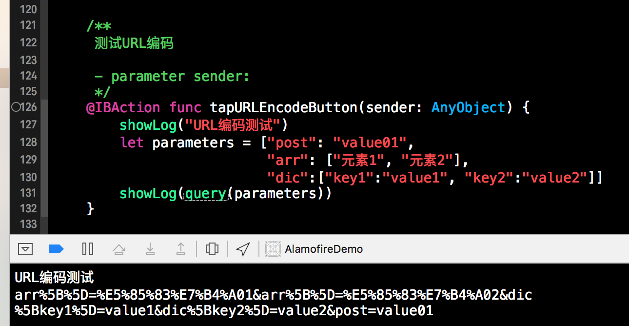调用上述代码段的query方法就可以对字典进行转义。query()方法的参数是一个[String, AnyObject]类型的字典,返回参数是一个字符串。这个返回的字符串就是将该字典进行编码后的结果。接下来我们对其进行测试。点击"URL编码"按钮就会执行下方的方法,在该方法中我们定义了一个字典,该字典的key是String类型的,Value中存储的有String、Array以及Dictionary。将该字典作为参数传入query()中,然后query()函数返回的字符串进行数据。紧跟着的就是输出结果,从结果中我们能看出将中文字符进行了百分号编码,也就是URL编码。