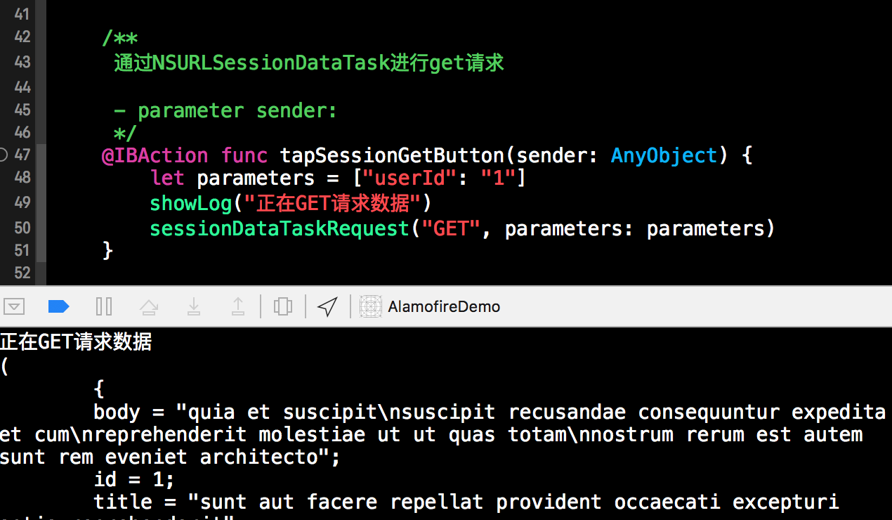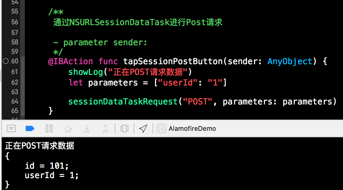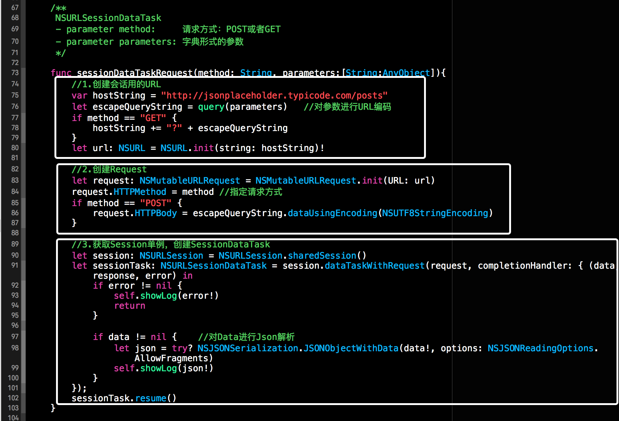 下方截图中的sessionDataTaskRequest()方法,该方法的第一个参数是会话请求的方式"POST"、"GET"等。第二个参数就发送到服务器的参数,该参数是一个[String:AnyObject]类型的字典。下面就是NSURLSessionDataTask的使用步骤