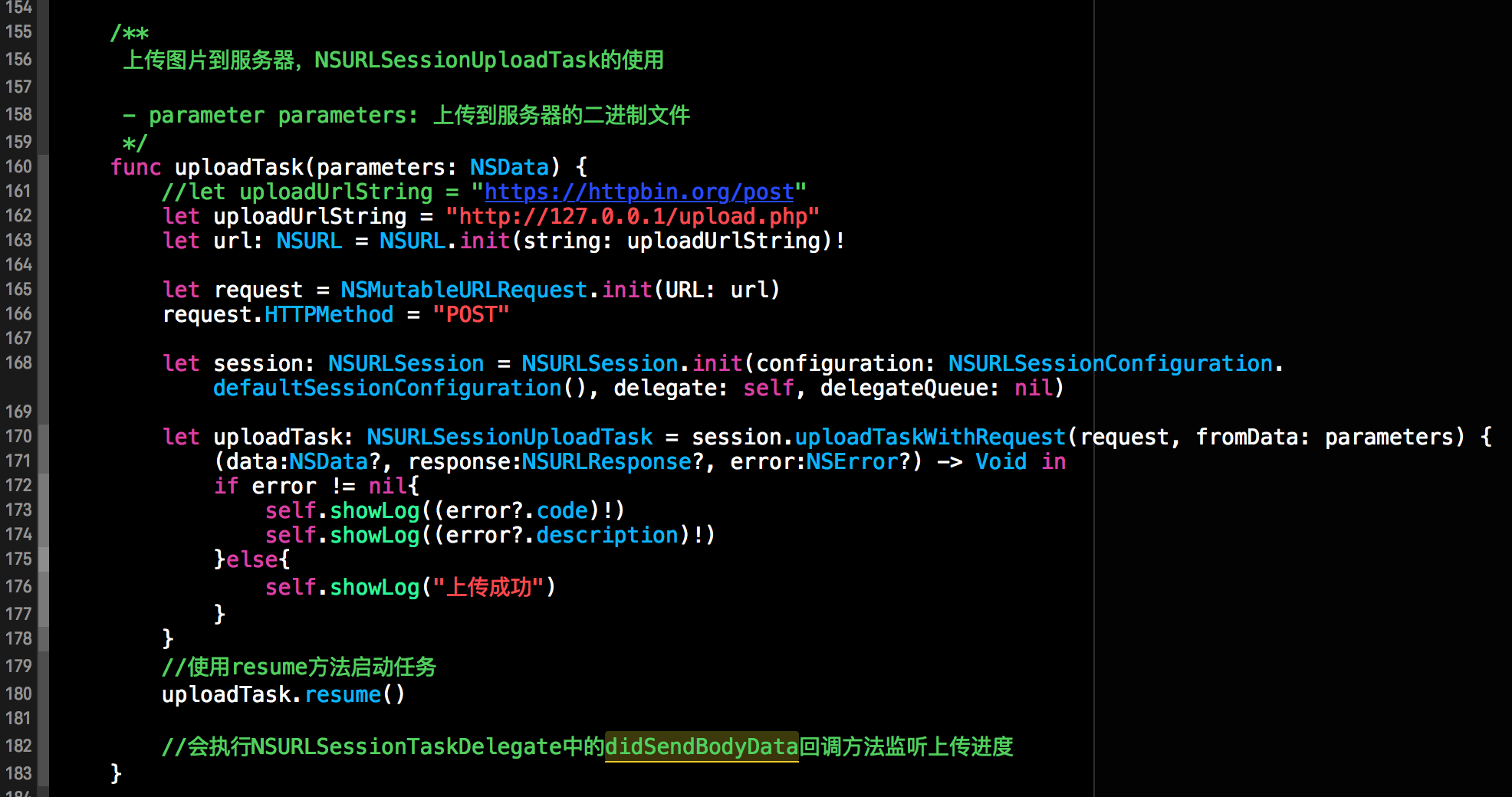 接下来我们来搞一下Upload Task,顾名思义Upload Task就是用来往服务器上上传东西的嘛。下方这个代码段就是用来往服务器上传二进制数据的,当然 我们使用的是POST方式进行表单提交的。下方的代码步骤与上述DataTask的使用方式大为相似,具体步骤如下所示。