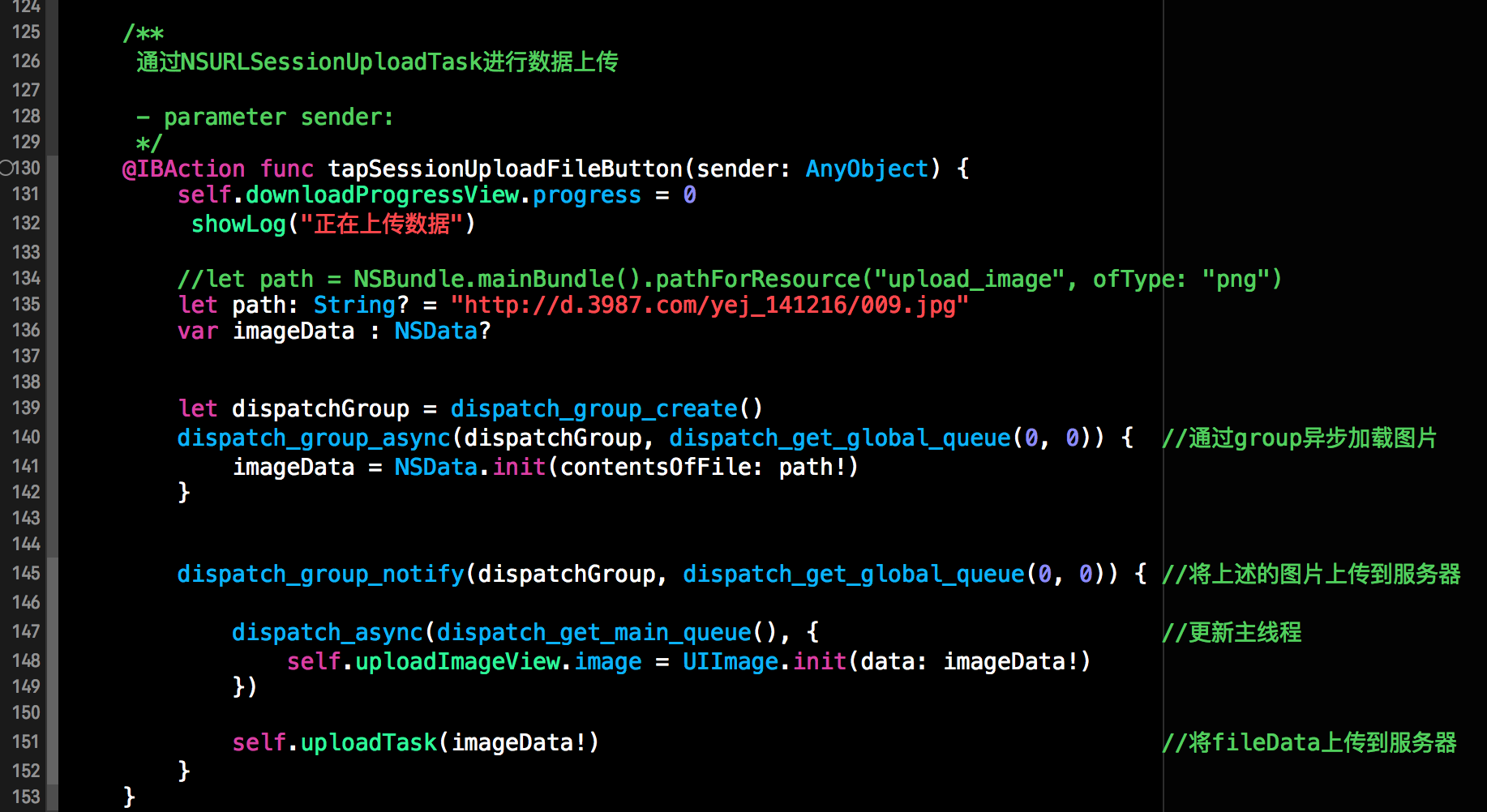 接下来我们要将上述代码进行测试,上面有两测试地址,第一个是你可以使用的,第二个是我在我本地服务器自己使用php写的一个文件上传的脚本,当然你是使用不了的。如果你要运行上述代码的话,你就要使用第一个地址进行测试了。下方代码段就是我们的测试用例,首先我们先通过网络获取图片,并NSData加载到本地,获取到图片的二进制数据imageData。等待图片数据获取完毕后,在调用上述上传数据的方法。为了请求完图片的二进制数据后在调用上述方法,我们使用了GCD中dispatch group的相关东西。关于GCD更为详细的内容请参见之前的博客《GCD详解》。下方的代码会在点击"UploadTask"按钮时会被触发。