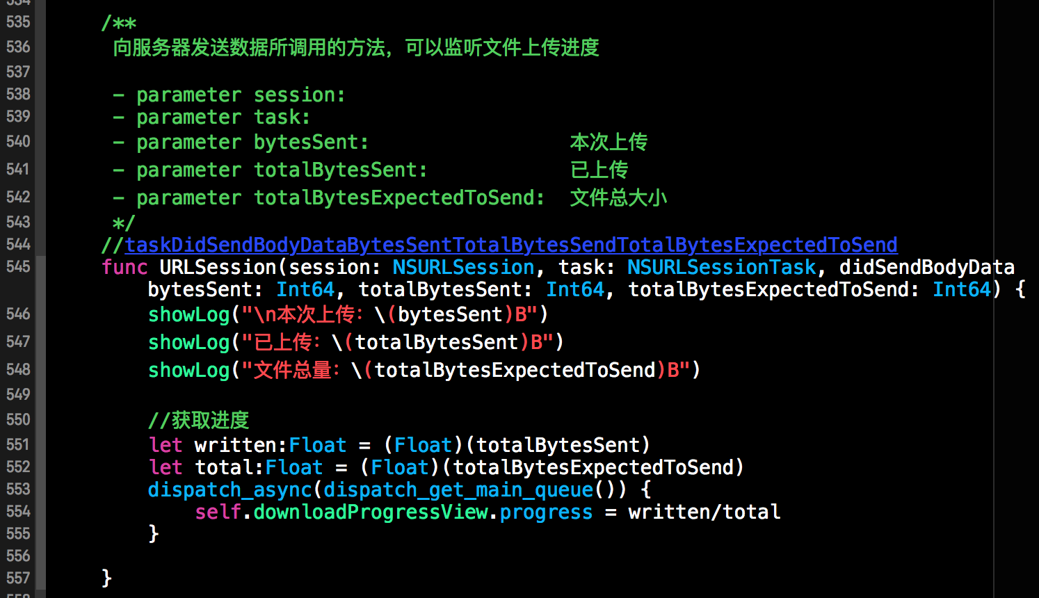 在上传文件时,如果你想时刻的监听上传的进度,你可以去实现NSURLSessionTaskDelegate中的didSendBodyData方法,该方法会实时的监听文件上传的速度。bytesSent回调参数表示本次上传的字节数,totalBytesSend回调参数表示已经上传的数据大小,