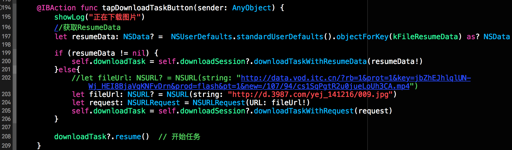 创建好downloadSession对象后,我们就该创建downloadTask开始进行文件的下载了。下方代码段就是点击"开始下载"按钮所触发的方法。首先我们先获取ResumeData,这个ResumeData就是我们暂停下载任务是所保存的信息,通过该ResumeData我们可以接着上次的文件进行下载。ResumeData中存储的并不是我们上次下载的数据Data,而是存储了下载地址和上次下载的位置等相关的信息,稍后会将ResumeData进行打印。我们从UserDefault中获取ResumeData,如果存在ResumeData我们就调用下载会话的downloadTaskWithResumeData()方法传入ResumeData接着上次的下载。如果ResumeData为nil,那么我们就创建下载请求,调用下载会话的downloadTaskWithRequest()方法创建下载任务。创建完下载任务后不要忘记将任务进行resume()呢。点击"开始下载"的代码如下所示。