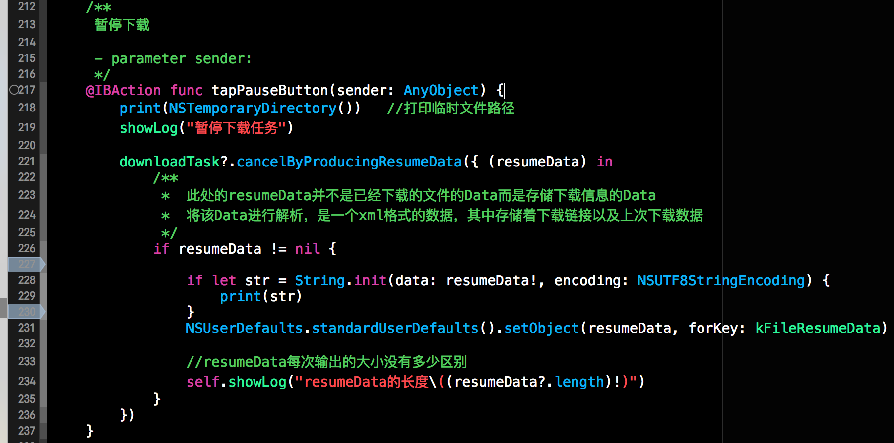 上面是开始下载,接下来让我们来实现暂停下载。下方代码段就是点击"暂停下载"按钮所触发的方法。在该方法中我们主要调用了downloadTask中的cancel ByProducingResumeData()方法来进行任务的暂停的。在调用上述方法时会通过Closure回调的形式返回一个ResumeData,此处的ResumeData就是上面我们使用到的ResumeData。拿到该ResumeData后你要讲它进行磁盘的持久化存储,便于下次继续下载。此处为了方便就将ResumeData存到了UserDefault中,其实也就是plist文件中。