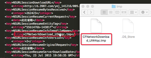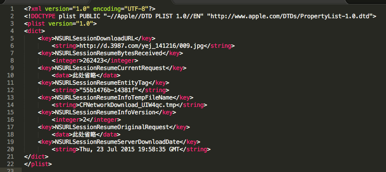 下方就是我们在暂停下载任务时所打印的ResumeData中的内容。从下方的内容不难看出ResumeData就是一个xml格式的文本信息其中存储着相应的下载信息。比如下载文件的URL(NSURLSessionDownloadURL),已经接受的数据字节(NSURLSessionResumeBytesReceived)等等相关的下载信息,具体请看下图。我们可以通过下方的xml存储的信息重新接着上次的下载任务进行下载。