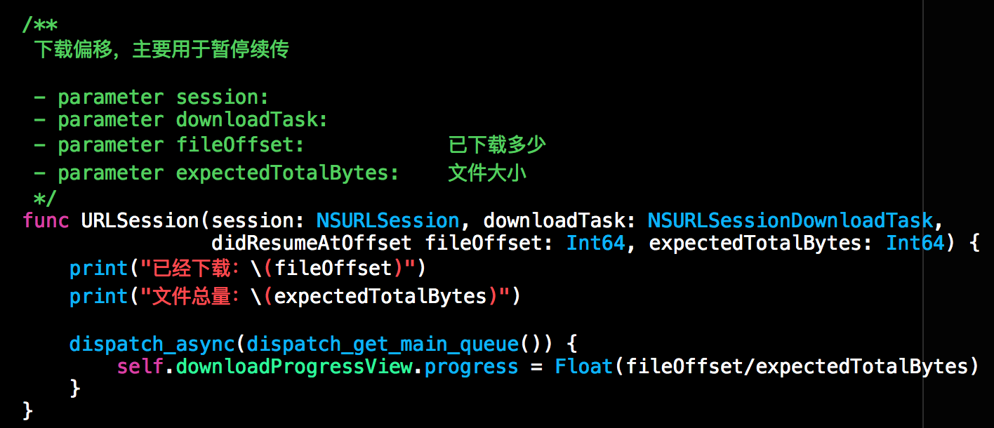 下方回调方法会在暂停的下载任务重启后会被调用。该代理回调方法中有四个回调参数,前两个就不多说了,我们来看后两个。fileOffset代表中已经下载文件的大小,expectedTotalBytes表示文件的总大小,如下所示: