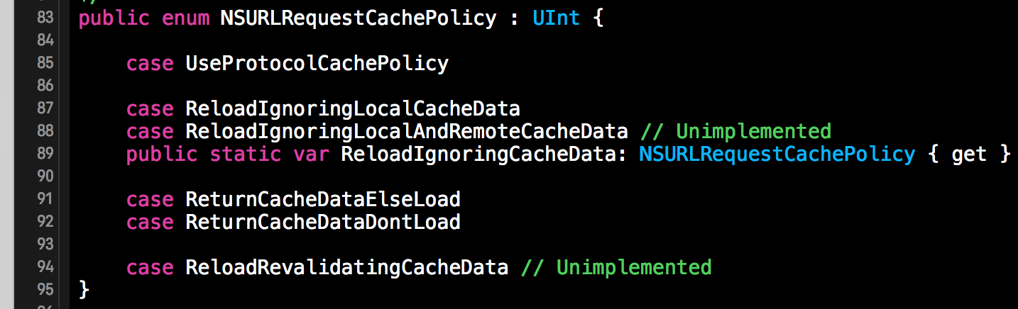 上述缓存策略在Foundation框架中是以枚举的形式来提现的,该缓存策略的枚举类型是NSURLRequestCachePolicy,具体定义如下所示: