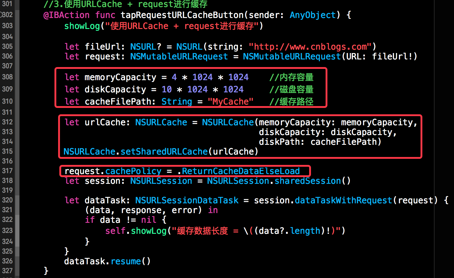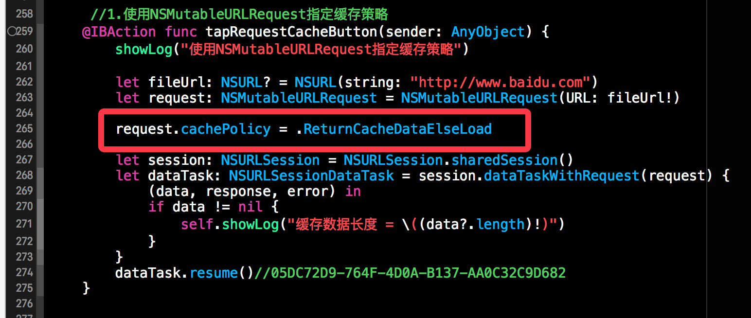 接下来我们使用NSMutableURLRequest来指定缓存策略,在NSMutableURLRequest类的对象中有一个参数cachePolicy用来指定缓存策略的,只需要将上述枚举的缓存策略的枚举值赋值给cachePolicy即可。下方代码段就是点击"Request设置缓存"按钮所触发的代码,在下方代码中我们使用DataTask对百度的网页进行请求,将请求的数据使用.ReturnCacheDataElseLoad的缓存策略进行缓存。下方红框的部分就是使用NSMutableURLRequest对象来设置缓存策略的代码,具体如下所示: