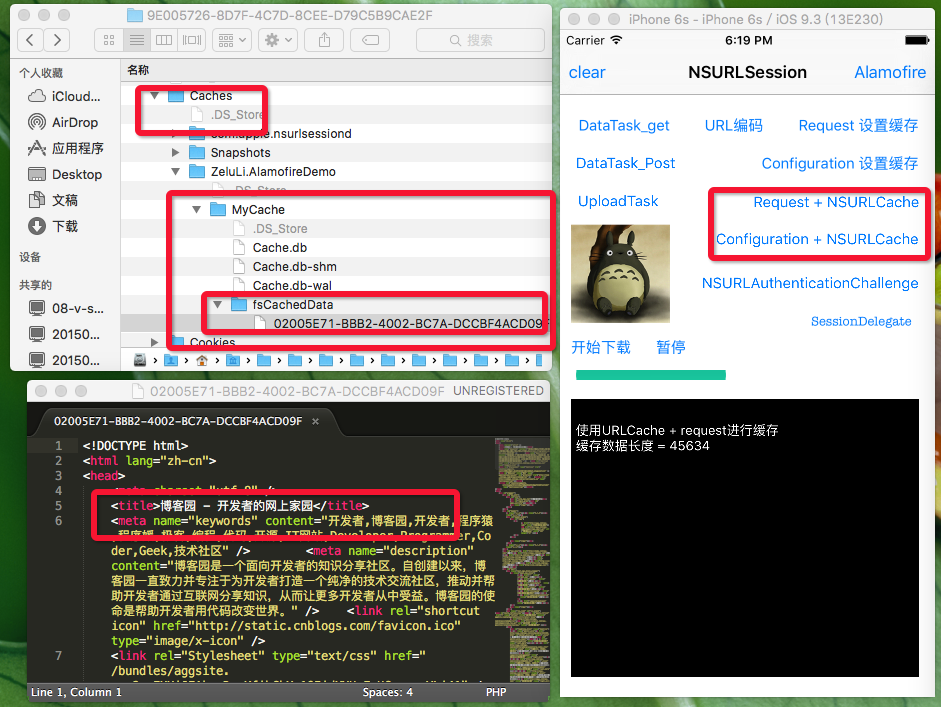 有一点需要注意的是此处设置的缓存路径是相对于/Library/Caches/[Boundle ID]/的,会在这个相当路径下创建相应的文件夹来存放缓存文件。下方就是我们使用NSURLCache缓存的文件路径已经内容,从内容不难看出就是博客园首页的HTML代码。效果如下所示: