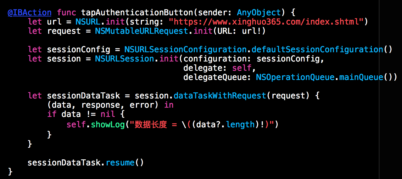 为了进行各种代理的测试,我们创建了下方专门用于代理测试的请求。网络请求的地址使用的是"https://www.xinghuo365.com",后面没有加index.shtml。因为直接请求域名星火金服会进行重定向,正好在我们相应的代理方法中进行请求重定向的处理。点击"SessionDelegate"按钮就会执行下方的方法。