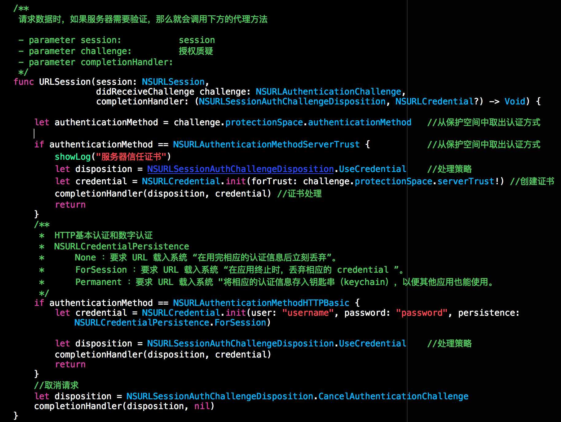 发起上述https请求后,就会执行下方的代理方法。下方的委托代理方法属于NSURLSessionDelegate中处理认证的方法,也就是如果服务器需要认证时就会执行下方的回调方法。下方代码首先从授权质疑的保护空间中取出认证方式,然后根据不同的认证方式进行不同的处理。下方给出了两种认证方式的处理,上面的if语句块 赋值服务端认证,下面的if语句块负责HTTP的基本认证。具体处理方式如下所示。有一点需要注意的是如果在该委托回调方法中如果不执行completionHandler闭包,那么认证就会失效,是请求不到数据的。