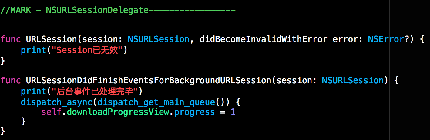 上面两段代码主要是用于下载任务的开始和暂停的,如果你要想对下载完成后的文件进行处理,以及要监听下载进度的话,就得实现NSURLSessionDownload Delegate代理中相应的方法了。NSURLSessionDownloadDelegate中有3个代理方法,分别负责处理文件下载完成,监测下载进度以及文件暂停时的处理工作。接下来将要结合上述下载任务的开始和暂停的代码来探讨一下这三个代理方法。
