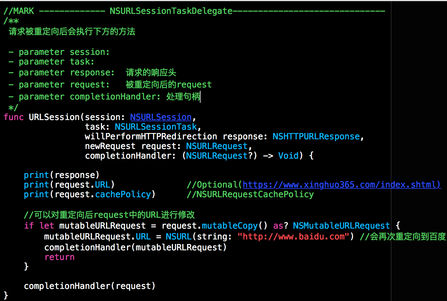 当我们请求的地址进行重定向时会执行NSURLSessionTaskDelegate中的willPerformHTTPRedirection方法,我们可以在此代理方法中对重定向的请求进一步的进行处理,甚至在此进行重定向。下方代码段的截图就是该URL重定向后要执行的方法,我们在此方法中将重定向的内容再次进行重定向,我们此处是重定向到的百度。具体做法如下所示。