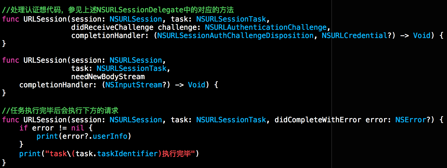 上面我们在证书认证时实现了一个didReceiveChallenge代理方法,该方法就位于NSURLSessionDelegate代理中。在NSURLSessionDelegate代理中除了didReceiveChallenge代理方法外还有两个方法。下方截图中就是这两个代理方法,