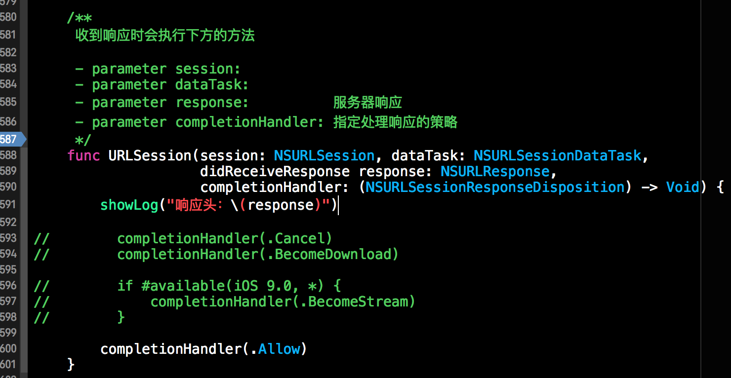 下方的回调方法会在我们执行Data Task时受到服务器响应时所回调的方法,在该方法中我们就可以指定上述相应的处理策略。下方我们指定的处理策略是Allow,就是允许继续执行数据的请求和处理。