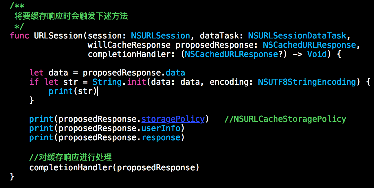 如果你在执行Data Task时,如果指定了响应的缓存策略,那么在请求数据完毕会会执行下方的willCacheResponse代理方法。顾名思义,willCacheResponse就是在将要进行缓存的使用多调用的,具体做法如下: