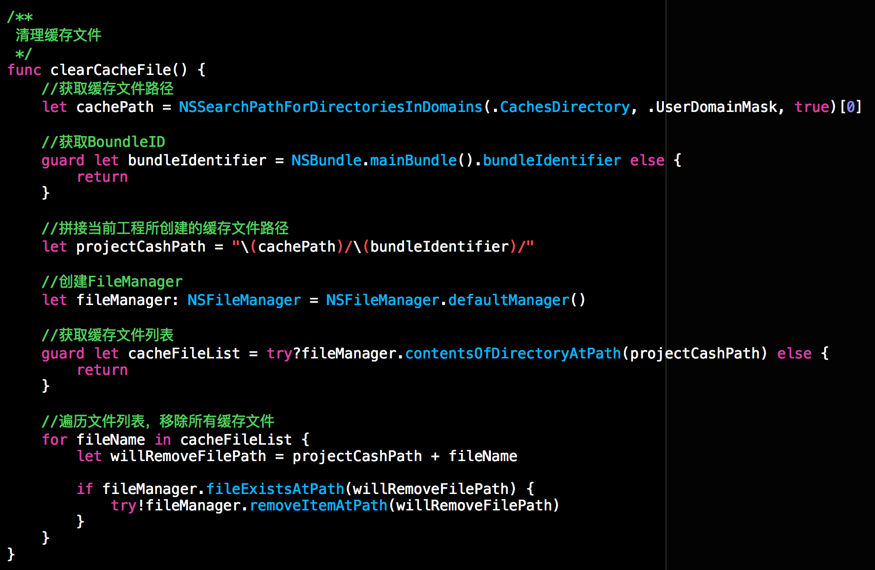 谁污染谁治理呢,创建完缓存,如果在不用时我们要对相应的缓存数据进行清理的。清理缓存就是找到缓存所在的文件夹将缓存的文件进行删除即可。下方代码段就是对我们上面创建的所有缓存进行清理。因为下方的每行代码基本上都有注释,在此就对其做过多的解释了。主要还是NSFileManager的使用。如下所示: