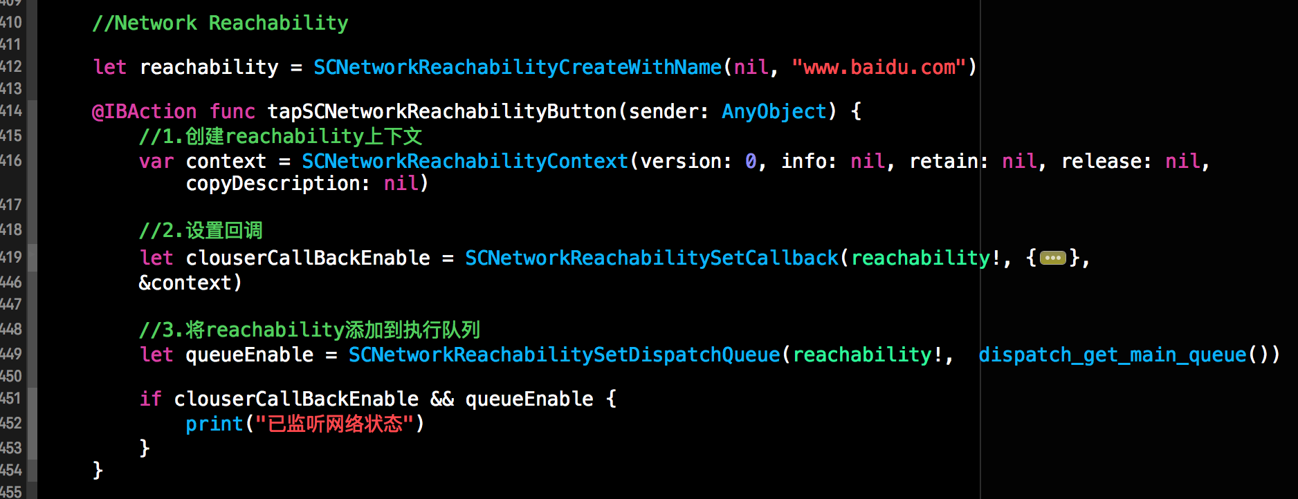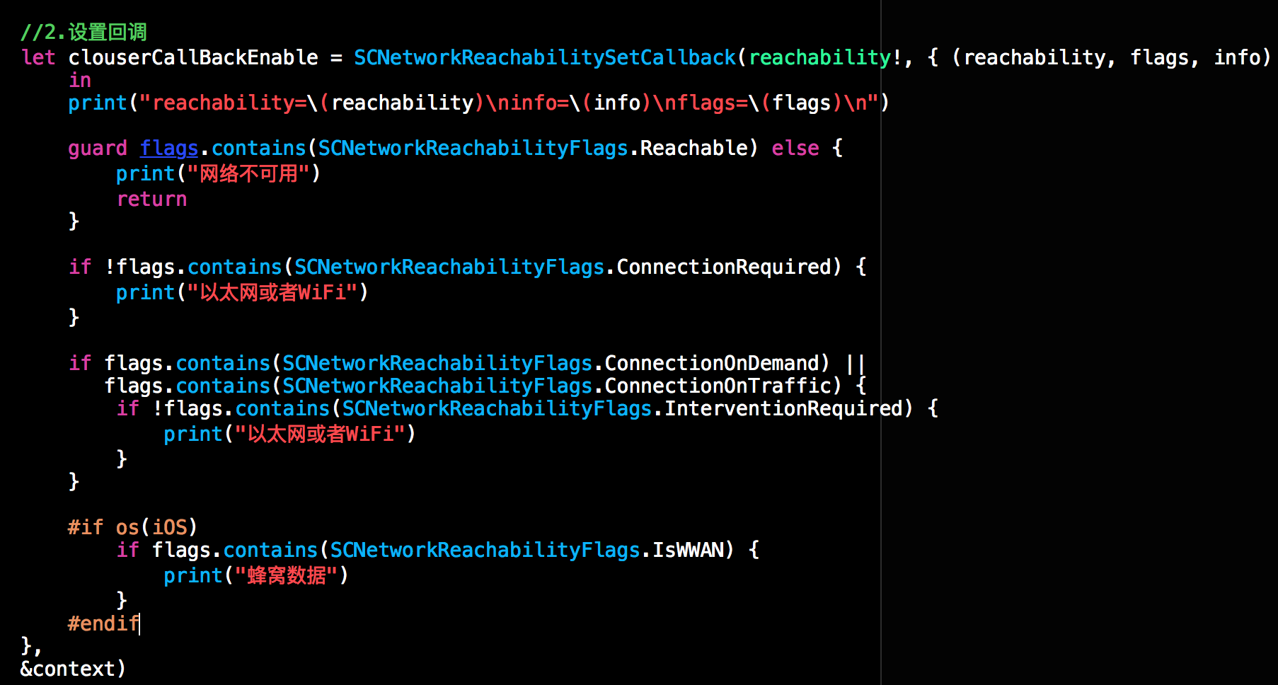 下方这个代码段就是使用SystemConfiguration相关的内容来进行网络状态的监测。首先我们先使用SCNetworkReachabilityCreateWithName来创建一个reachability对象,然后创建reachability的上下文,之后在设置网络状态改变后的回调,随后将reachability对象放到队列中进行执行,具体步骤具体代码如下所示:
