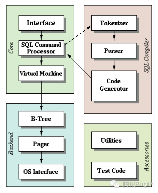 Core 层。包括了接口层、编译器和虚拟机。通过接口传入 SQL 语句,由编译器编译SQL生成虚拟机的操作码 opcode。而虚拟机是基于生成的操作码,控制 Backend 的行为。