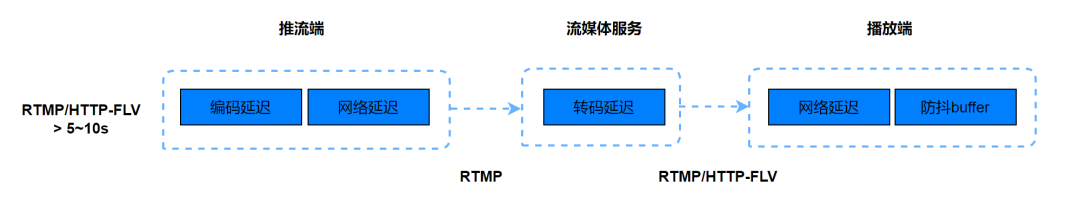- 播放端——网络延迟 100ms ~ 200ms 左右,主要是链路分发节点之间的传输延迟;防抖 buffer——5 ~ 8s