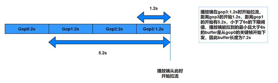 字节与 CDN 厂商沟通约定 gop cache 按照下限优先来下发数据,比如下限 6s,表示先在缓存数据中定位最新 6s 的数据,然后向 6s 前的旧数据查找第一个关键帧下发,保证下发第一帧距离最新帧之间的时长不低于 6s: