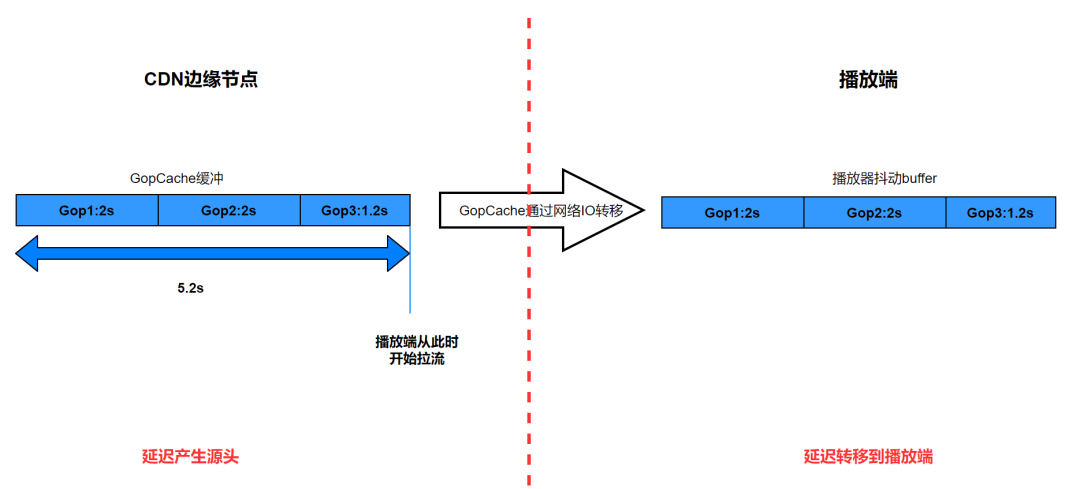 不考虑回源的情况,这个环节主要影响延迟的是 gop cache 策略(有的 CDN 厂商也叫做快启 buffer 策略或者快启 cache),即在边缘节点缓存一路流最新的几个 gop(一般媒体时长平均为 5 ~ 7s),目的是为了在拉流请求建立时,可以有媒体数据即时发送,优化首帧和卡顿,这样也就导致了播放端收到的第一帧数据就是 5 ~ 7s 前的旧数据,第一帧的延迟就达到了 5 ~ 7s(这个环节才是端到端延迟过大的根因)。