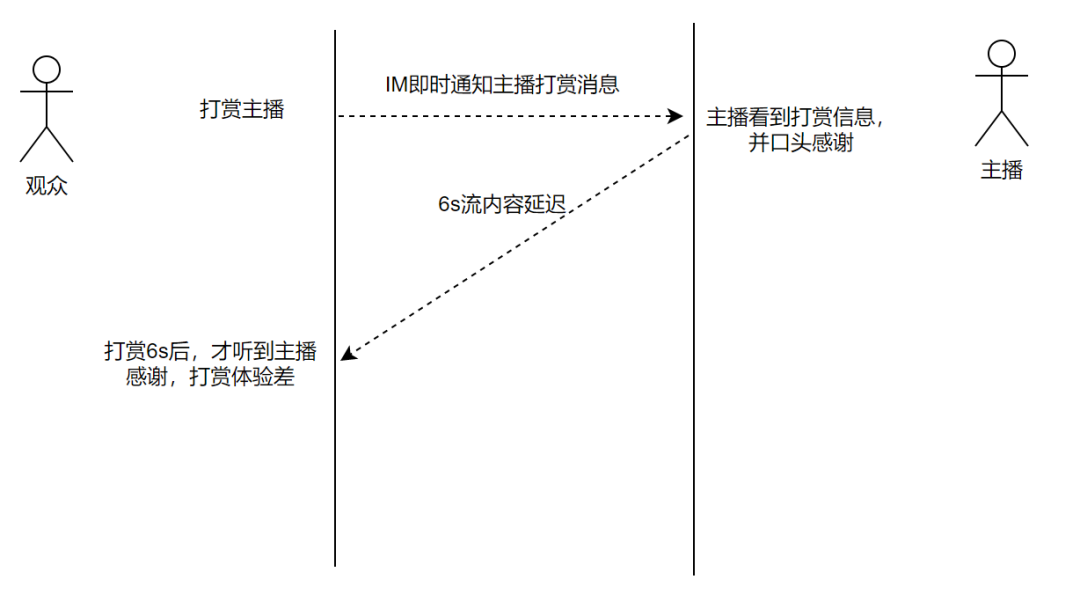 打赏场景,互动延迟由面对面的 0s,增加到了 6s,如下图所示: