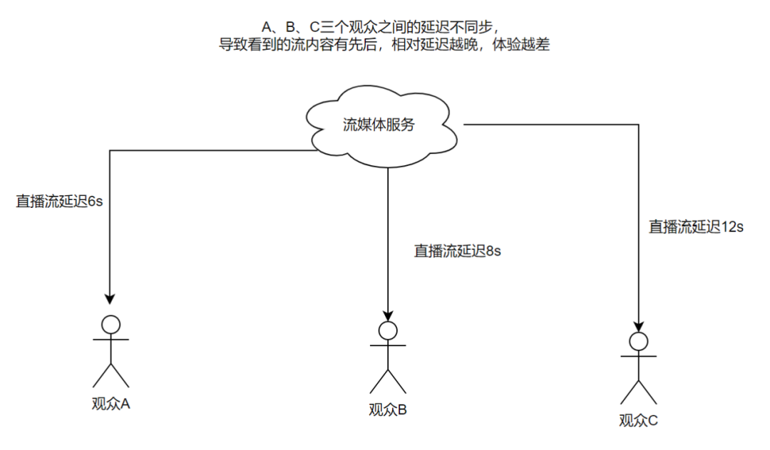 这个场景的延迟体验问题,并不是某次拉流请求端到端高延迟导致的,主要是因为不同用户间的延迟不一致导致,如下图: