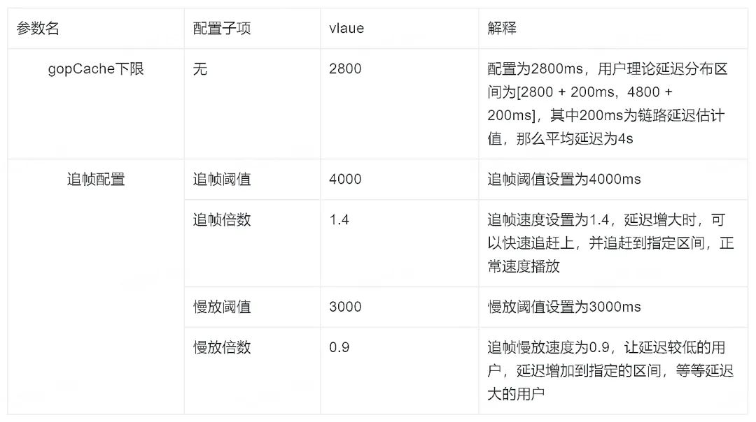 - 参数配置目标:降低不同设备间延迟差,控制用户延迟分布在[3000ms, 4000ms]内,这样保证设备间延迟差最大不超过 1s——延迟低的用户慢放,延迟高的用户追帧,从而更精确的控制设备延迟差低于 gop 长度 2s
