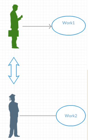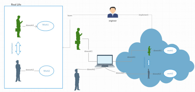 在没有软件之前,每个人干自己的工作,自行保存自己的工作结果。人们面对面或者通过电话等沟通,如下图所示。