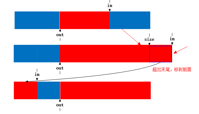 这看起来与普通的环形缓冲区没有什么差别,但是让人叹为观止的地方就是它巧妙的用 in 和 out 的关系和特性,处理各种操作,下面我们来详细分析。