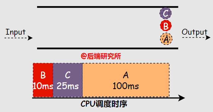 假如有ABC三个进程同时进入等候使用CPU资源的队列FIFO,A进程占用CPU运行100ms,B进程10ms,C进程25ms,根据SJF算法的规则,可知:- 进程执行顺序是B->C->A
