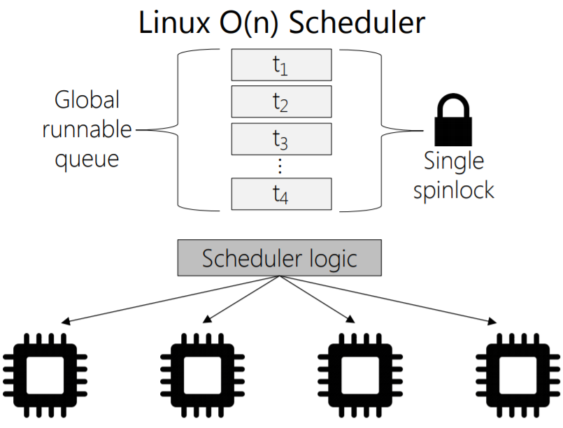 - O(n)调度器采用全局runqueue,导致多cpu加锁问题和cache利用率低的问题