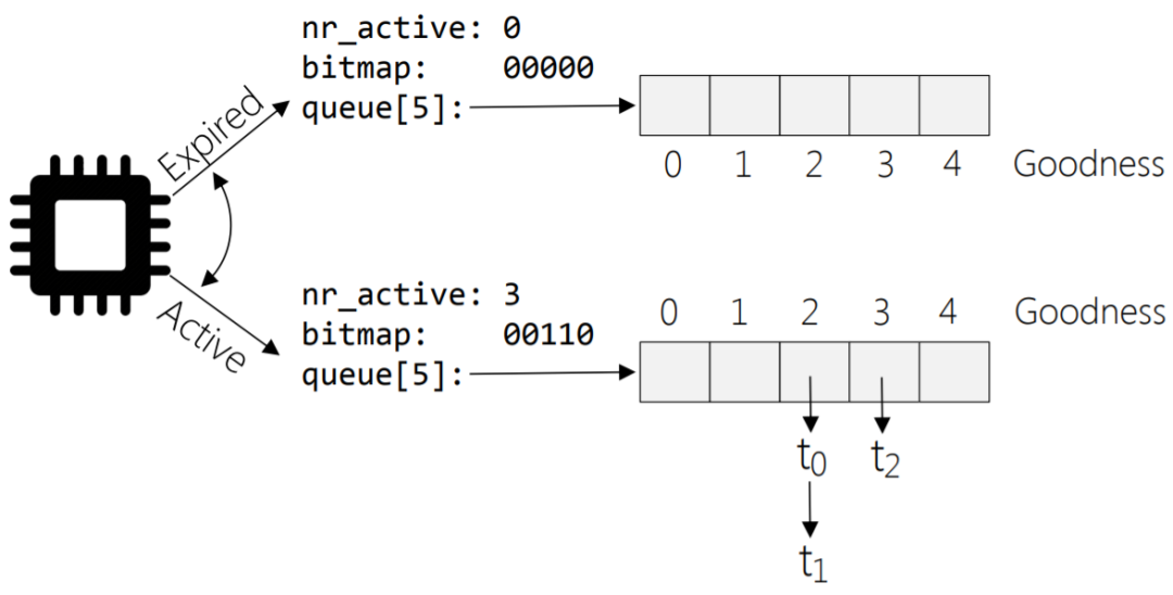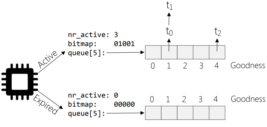 - O(1)调度器为每个cpu设计了一个runqueue,并且采用MLFQ算法思想设置140个优先级链表和active/expire两个双指针结构