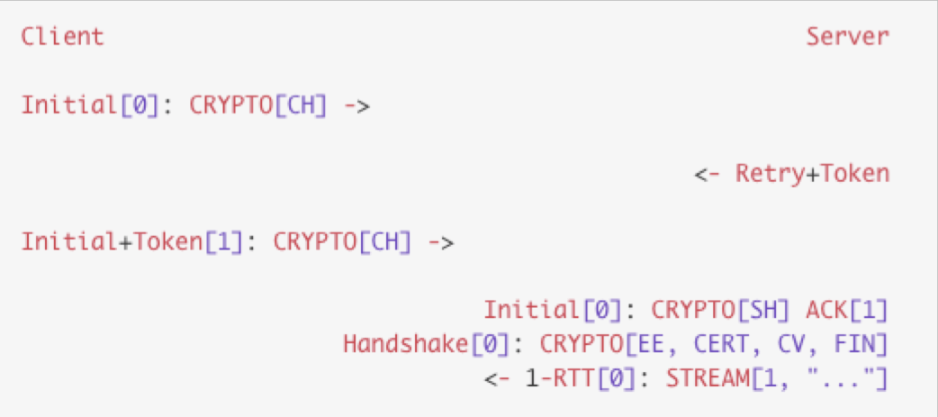- 连接建立时,为了验证客户端的地址是否是攻击者伪造的,服务端会生成一个令牌(token)并通过重试包(Retry packet)响应给客户端。客户端需要在后续的初始包(Initial packet)带上这个令牌,以便服务端进行地址验证。