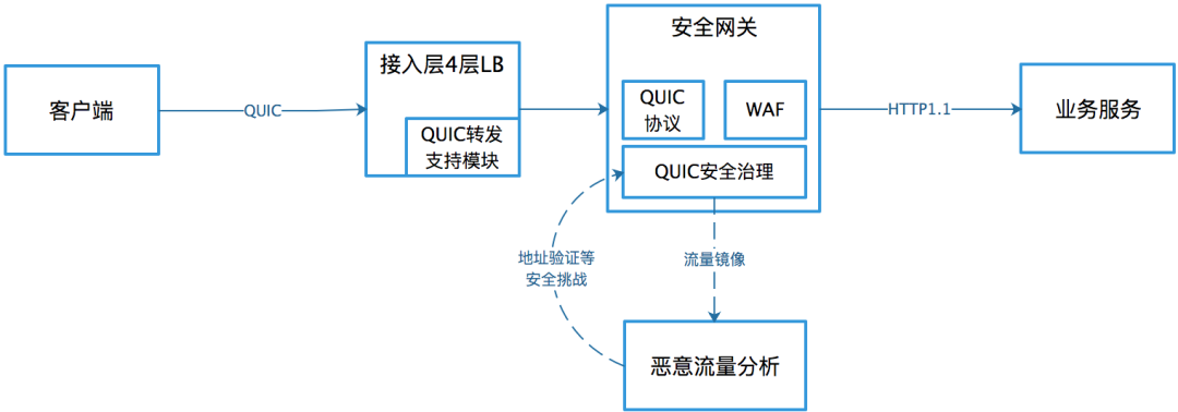 为了提升QUIC的安全能力,我们在使用QUIC基础支持WAF安全能力,把WAF直接融入到安全QUIC服务的处理中。同时从QUIC里面抽象出安全治理模块可以在很多场景直接发起对源地址的验证挑战。
