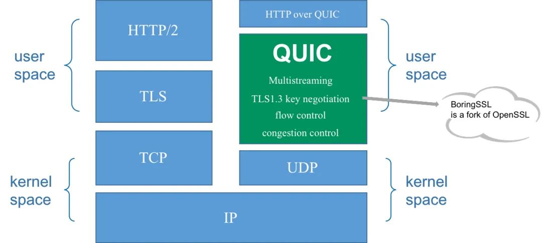 在当代网络通讯中,高速且安全的网络接入服务已为互联网厂商的共同追求。针对传统的TCP + TLS的安全互联网服务,在各大头部互联网厂商中反响激烈,如google有提出各种升级和补丁方案,例如TCP fastopen, TLS1.3等,而基于TCP的传统体系已经有运行几十年,形成了固化甚至僵化的网络基础设施,导致补丁升级或者新方案融入变得非常困难。为了更体系化更自然且原生的解决这个问题,google从UDP的途径另辟蹊径创建性能更好、安全性更高的QUIC(Quick UDP Internet Connection)。IETF也把QUIC作为HTTP3的标准基础通讯设施。