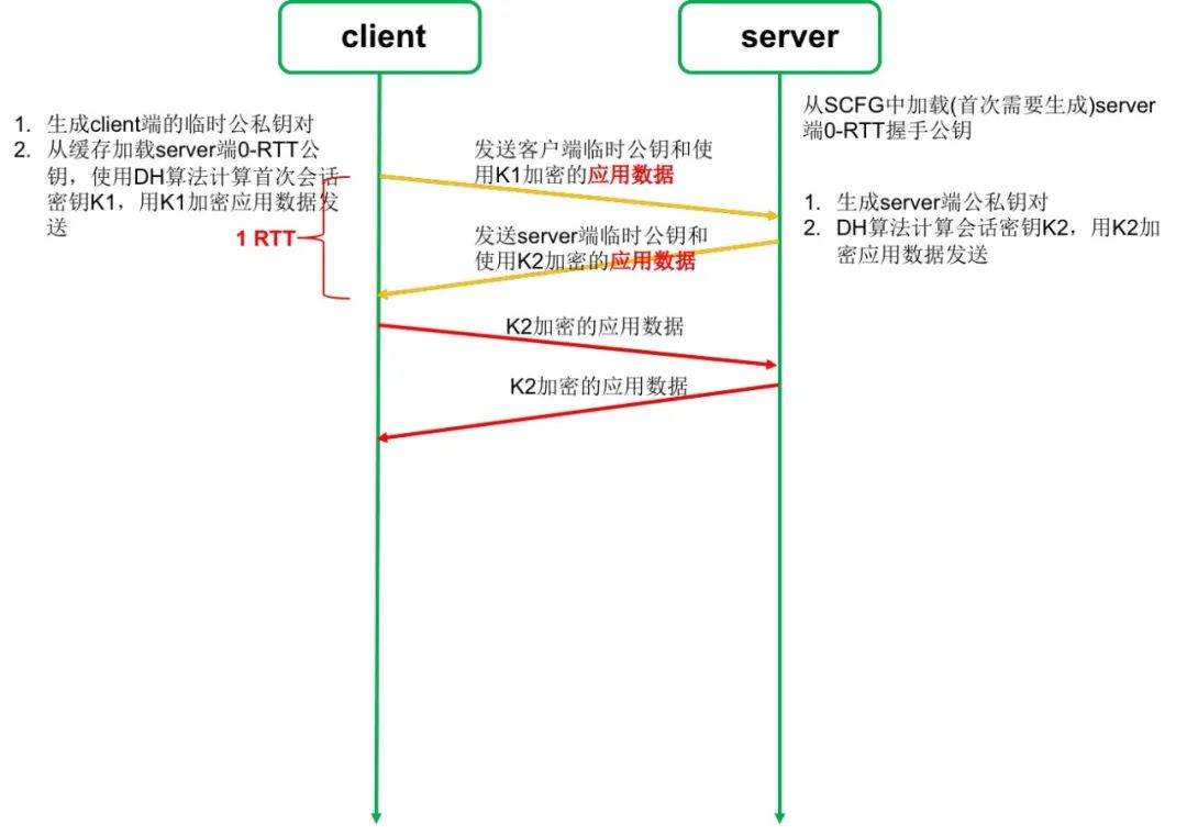 这个是QUIC的1-RTT过程,那么他的0-RTT又是怎么做的呢?其实很明显,客户端把0-RTT的握手公钥和相关信息保存起来,后续再建连接的时候就可以直接使用之前保存的数据了,只要这个数据没有过期,服务端都会承认的。因此可以避免掉公钥发送的这一个RTT,直接生成K1加密用户数据传输。