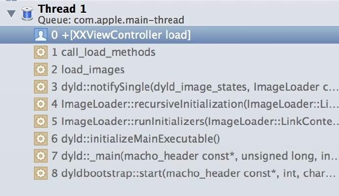 上图是在自定义的类XXViewController的+load方法断点的调用堆栈,清楚的看到整个调用栈和顺序: