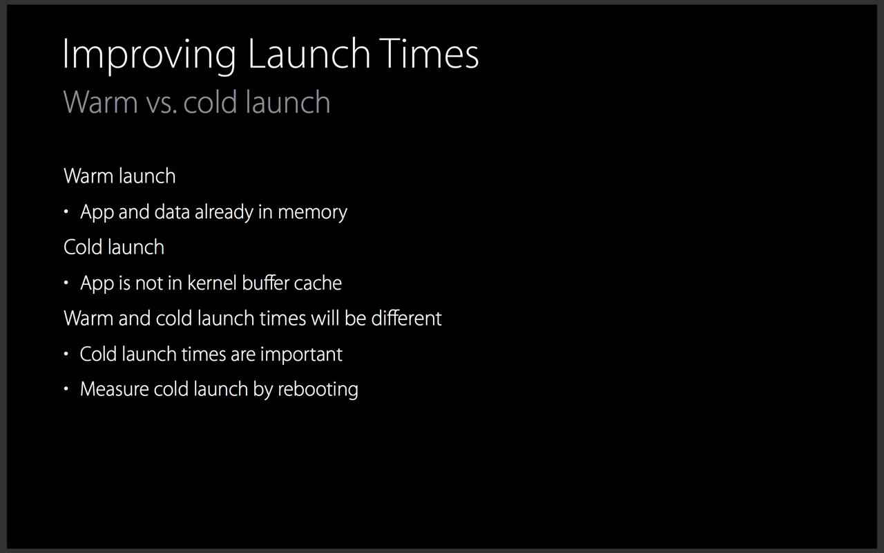 如果程序刚刚被运行过,那么程序的代码会被dyld缓存,因此即使杀掉进程再次重启加载时间也会相对快一点,如果长时间没有启动或者当前dyld的缓存已经被其他应用占据,那么这次启动所花费的时间就要长一点,这就分别是热启动和冷启动的概念,如下图所示: