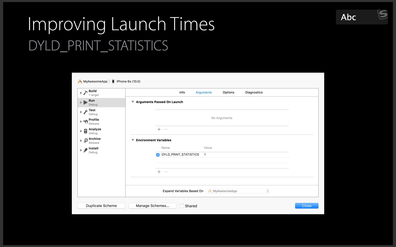 那么问题就来了,那怎么衡量main()之前也就是time1的耗时呢,苹果官方提供了一种方法,那就是在真机调试的时候勾选dyld_PRINT_STATISTICS选项。