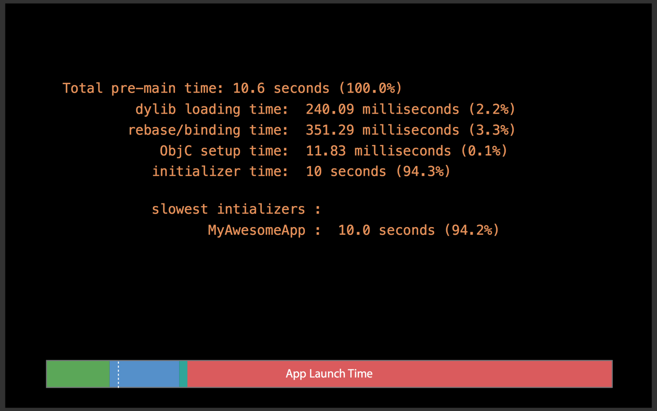 由此可见对于系统级别的动态链接库,因为苹果做了优化,所以耗时并不多,在这个awesome的例子中,自身App中的代码占用了整体时间的94.2%我们应用中一次典型的Log如下: