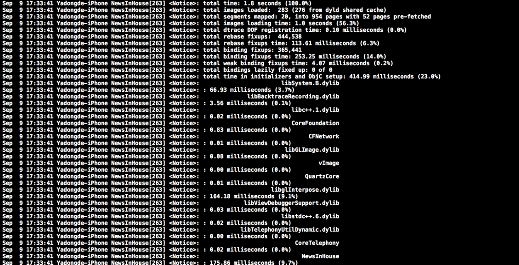 由此可见,最多的用时还是在image加载和OC类的初始化,共占用总时长的79.3%,精简framework的引入和OC类有优化的空间。
