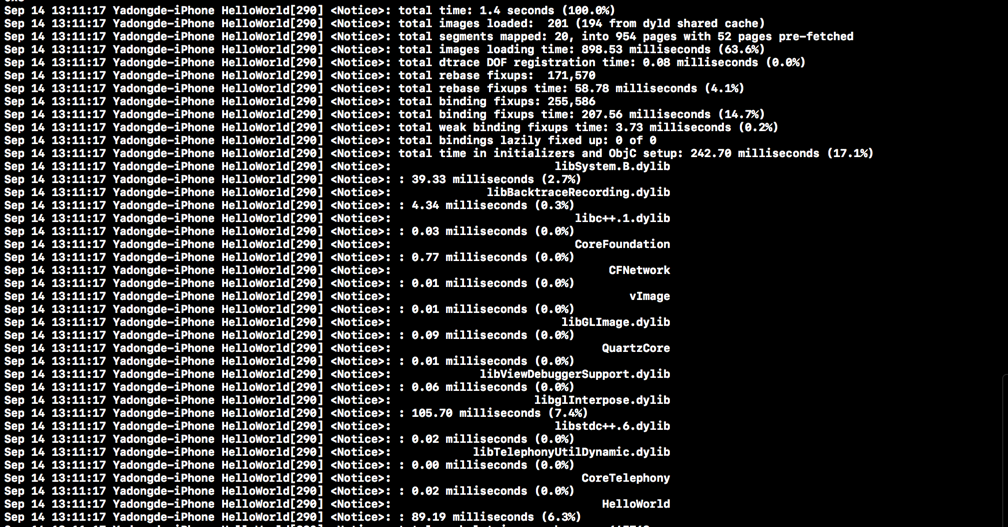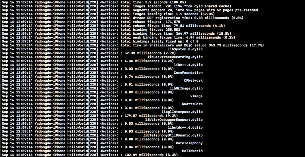 建立了一个空的HelloWorld工程,只加入了pods中的代码,不包含主端的业务逻辑代码,一次典型的冷启动基本接近2s iPhone6 iOS9.3.5系统测试主要时间在加载动态库,类/方法的初始化还有符号地址绑定阶段。